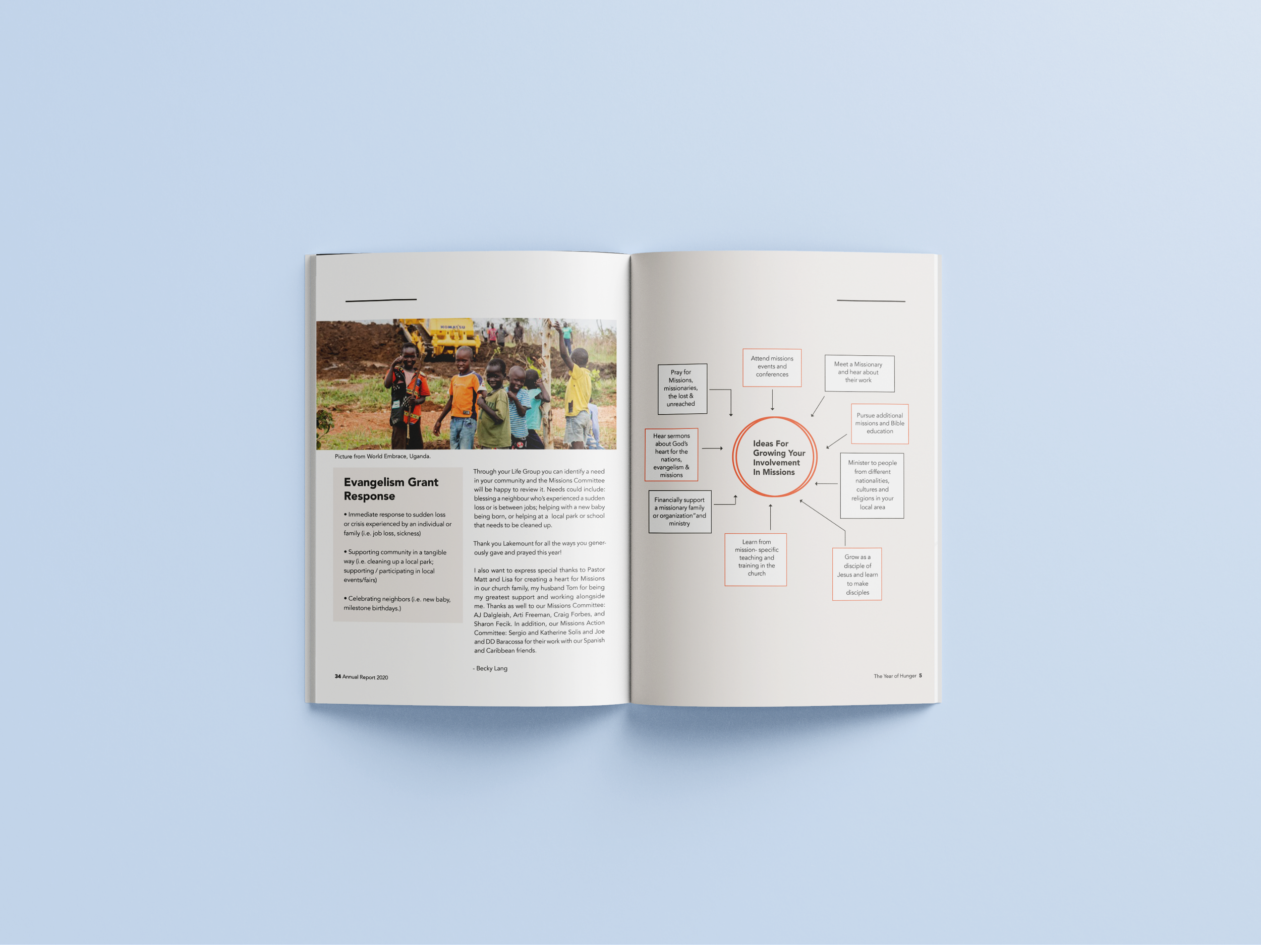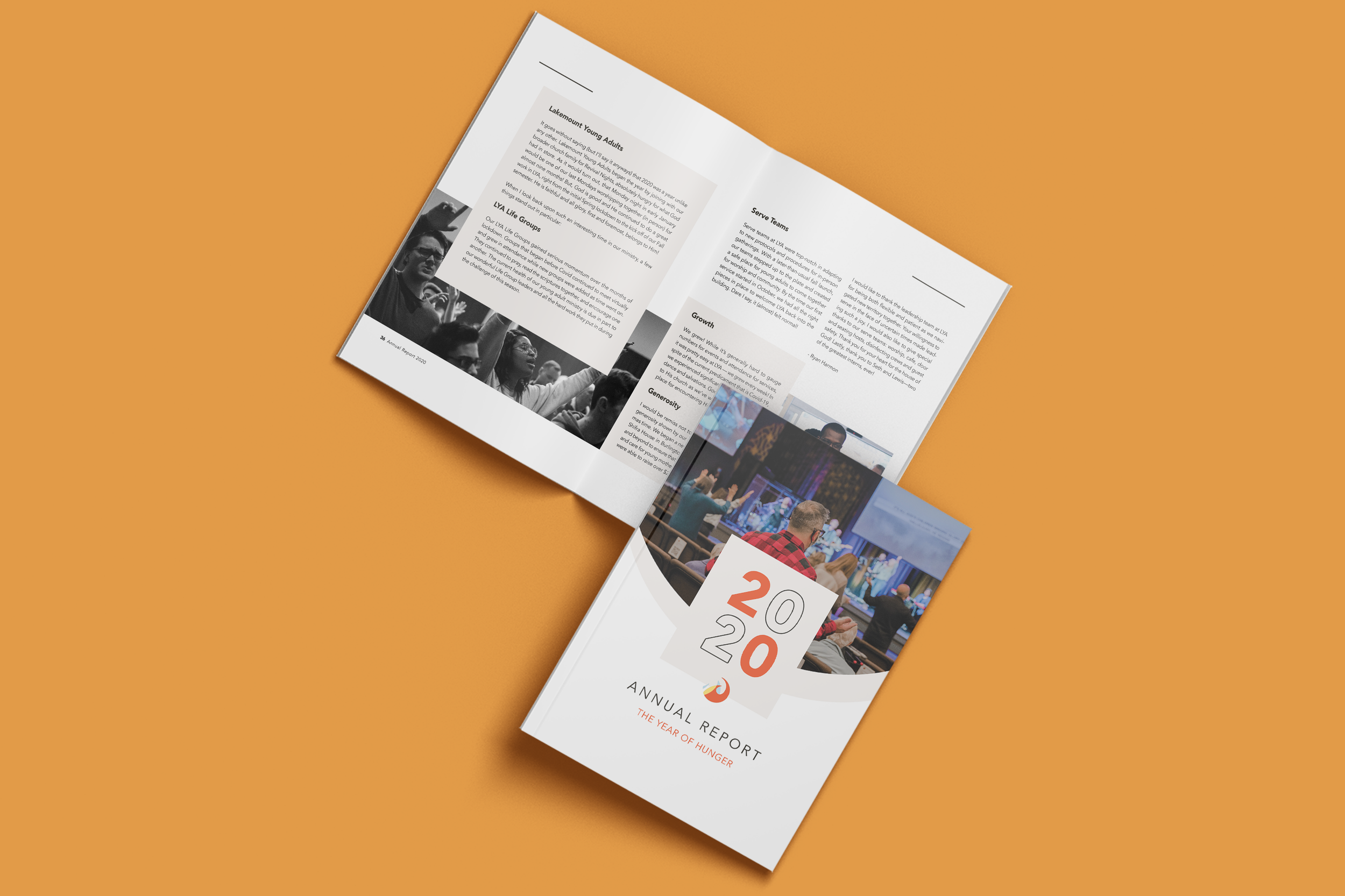 Tasked with rebranding and producing a church’s annual report, I led a cross-functional team of UX designers, copywriters, editors, and external print vendors to create a magazine-style piece delivered both in print and digital formats. My role spanned timeline management, creative direction, stakeholder alignment, and ensuring seamless execution across teams. The goal was to craft a product that visually and narratively captured the church’s year — highlighting stories of hope, connection, and impact within the community.